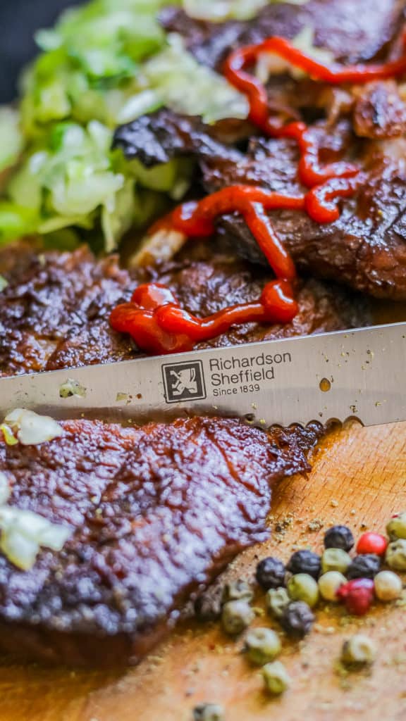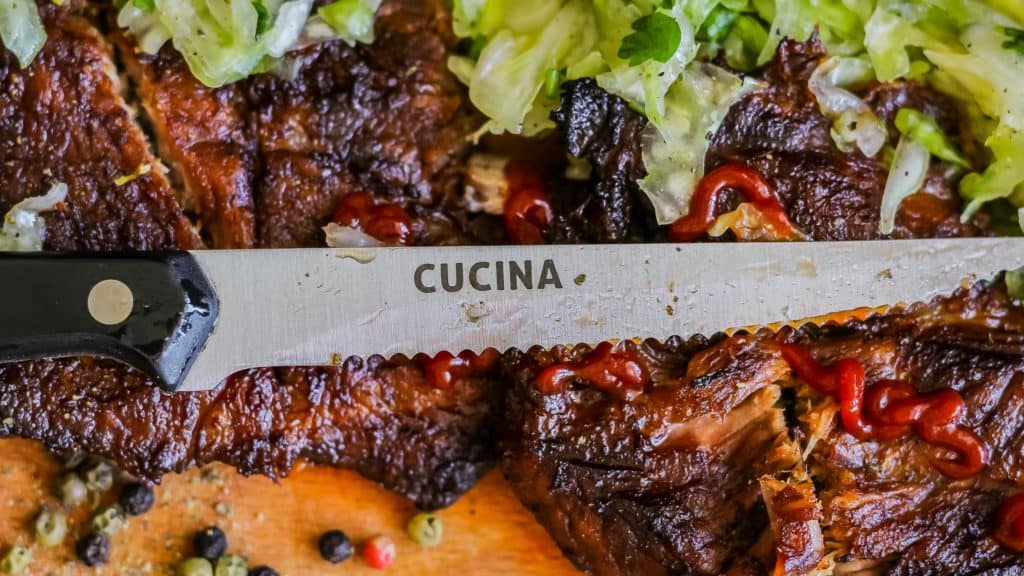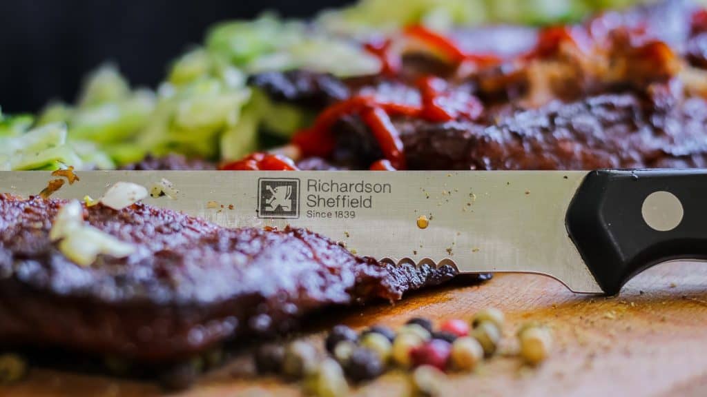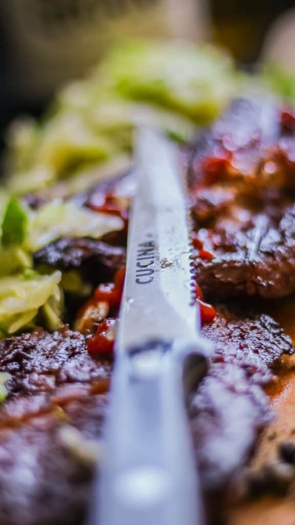 Noże do pysznych stejków ! Główny temat to w zasadzie nóż wbity w mięso. Dla podkreślenia loga, marki noża zastosowałem płytką głębię ostrości oraz wszystkie metody powyżej. Nie chciałem, aby jedzenie odciągało uwagę od ostrza. Również przełamanie koloru czymś dodatkowym jak czerwony sos działa według mnie bardzo dobrze – poza tematem przyciąga uwagę do innych elementów kadru.